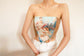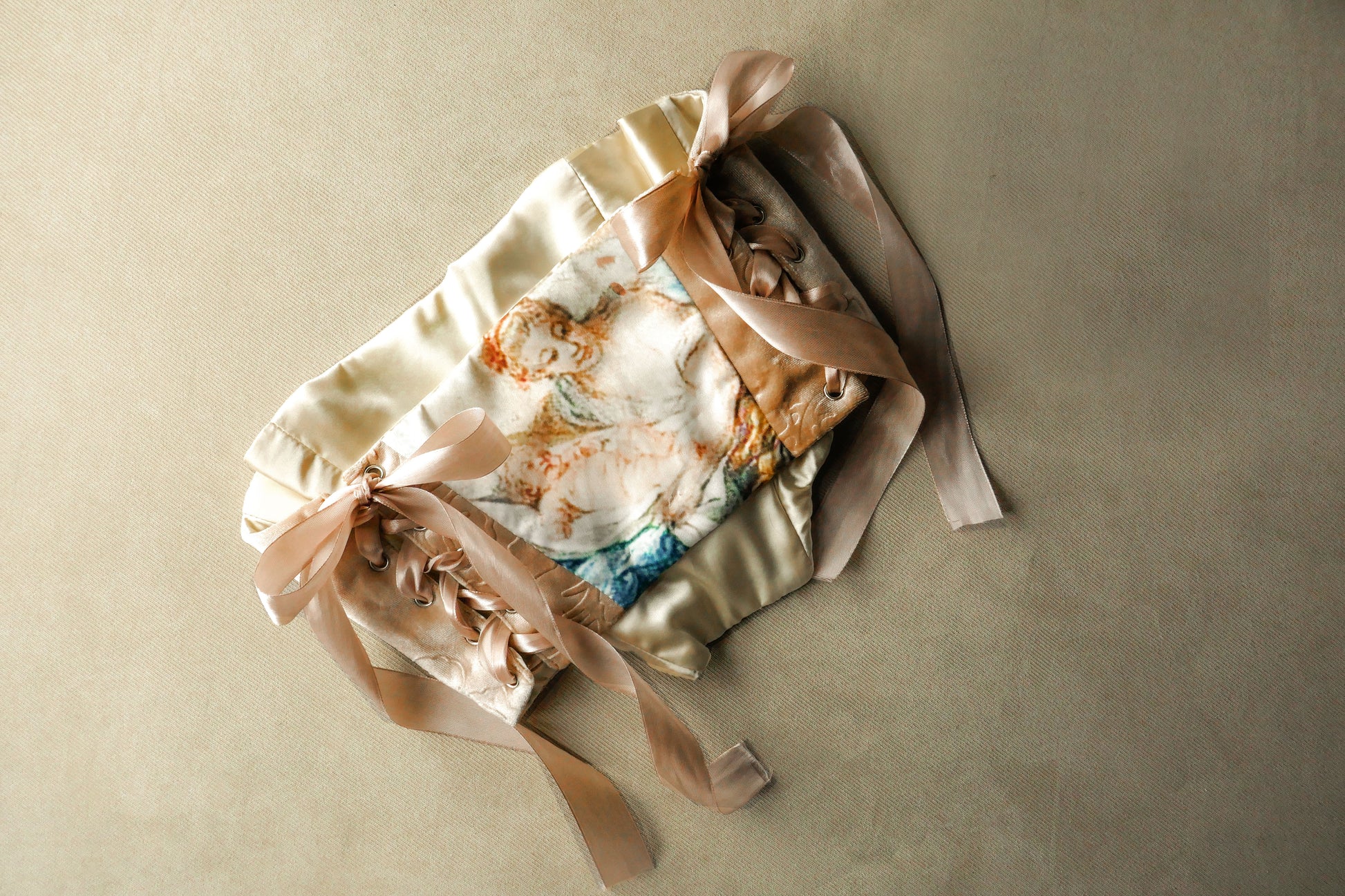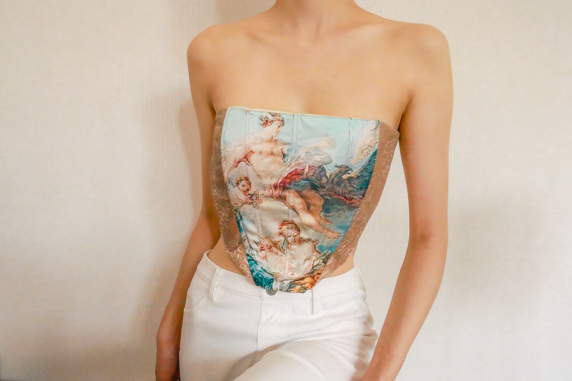Aurora is made from our lustrous satin and velvet brocade in rose gold hue. It features our incredible corsetry boning for a more appealing and structured look. With a contemporary neckline, this strapless design fastens with ribbons on both sides at the back! Wear yours with your fave high-waisted denim, heels, and mini bag.