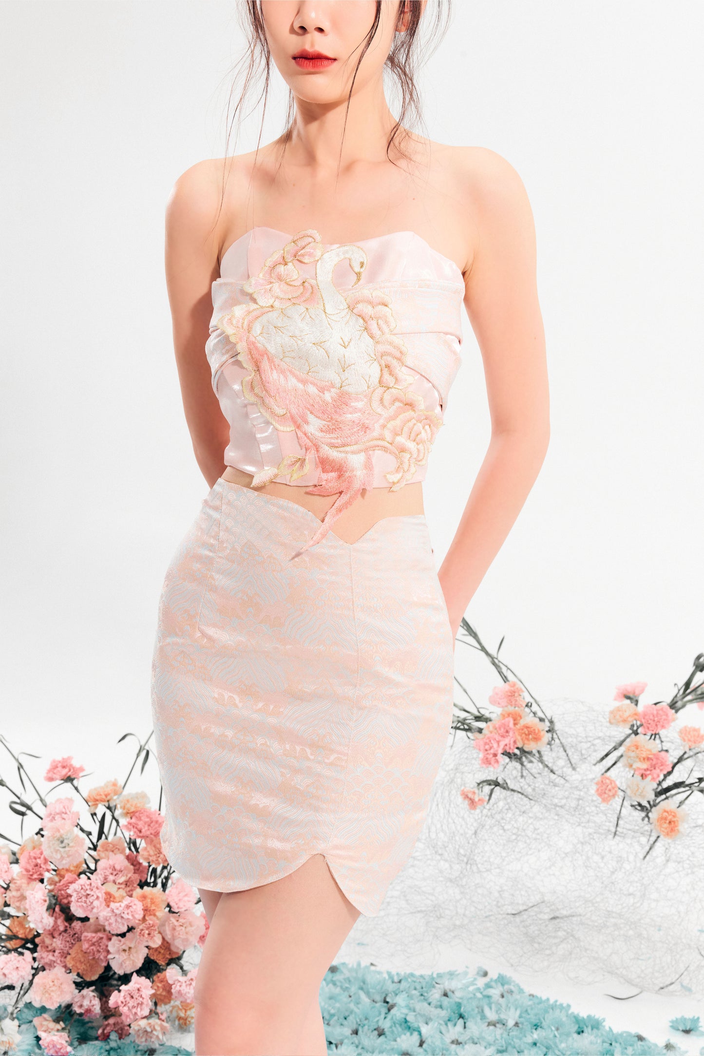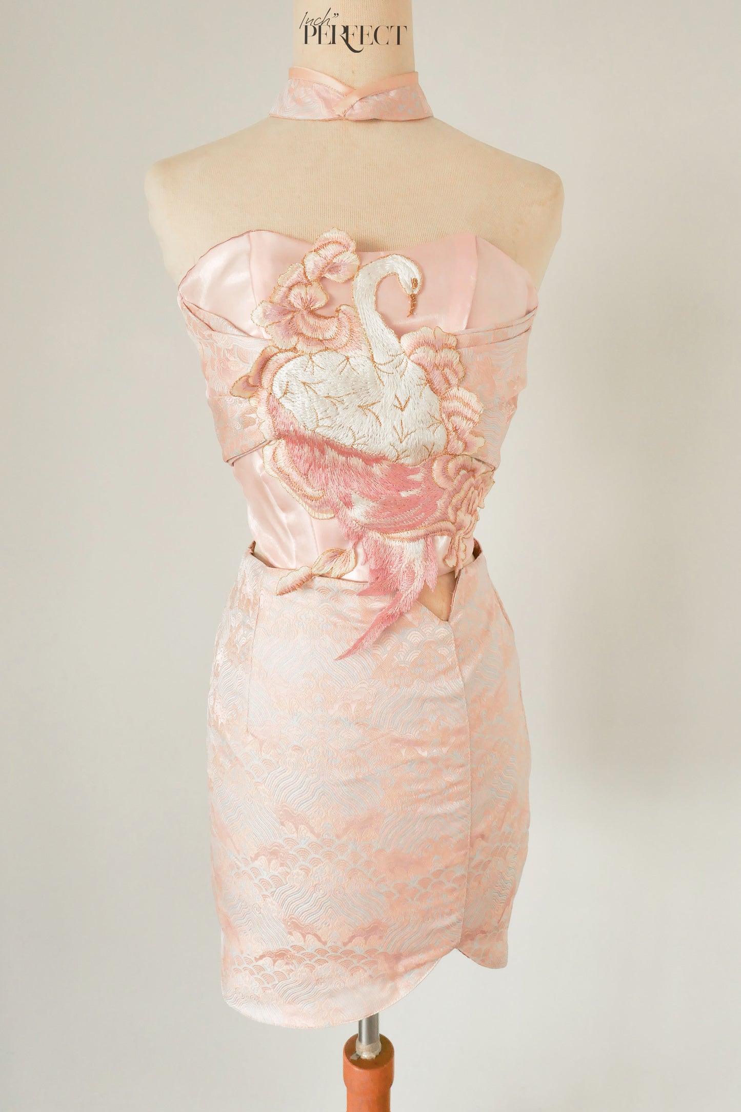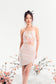 The model is 174cm tall, wearing size XS for tops and size M for bottoms. For dresses, she wears size M, tailored to her measurements for the photoshoot.