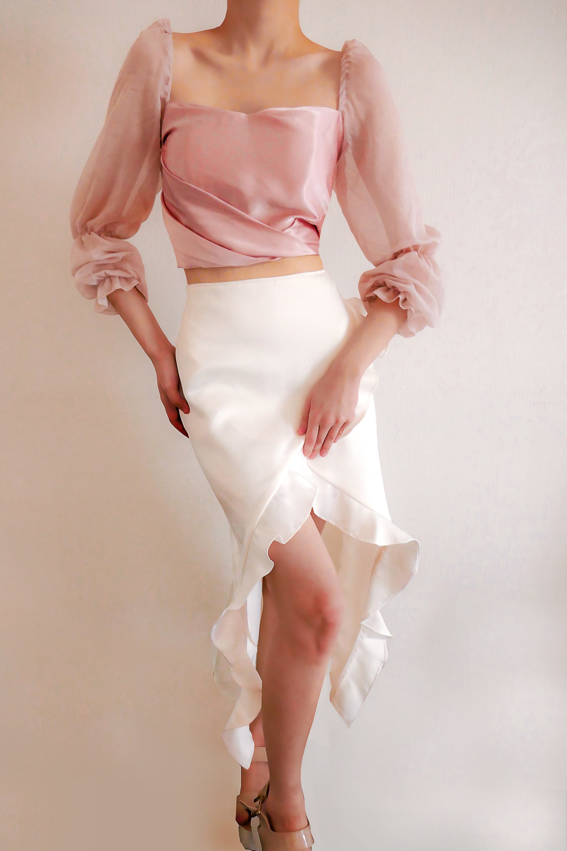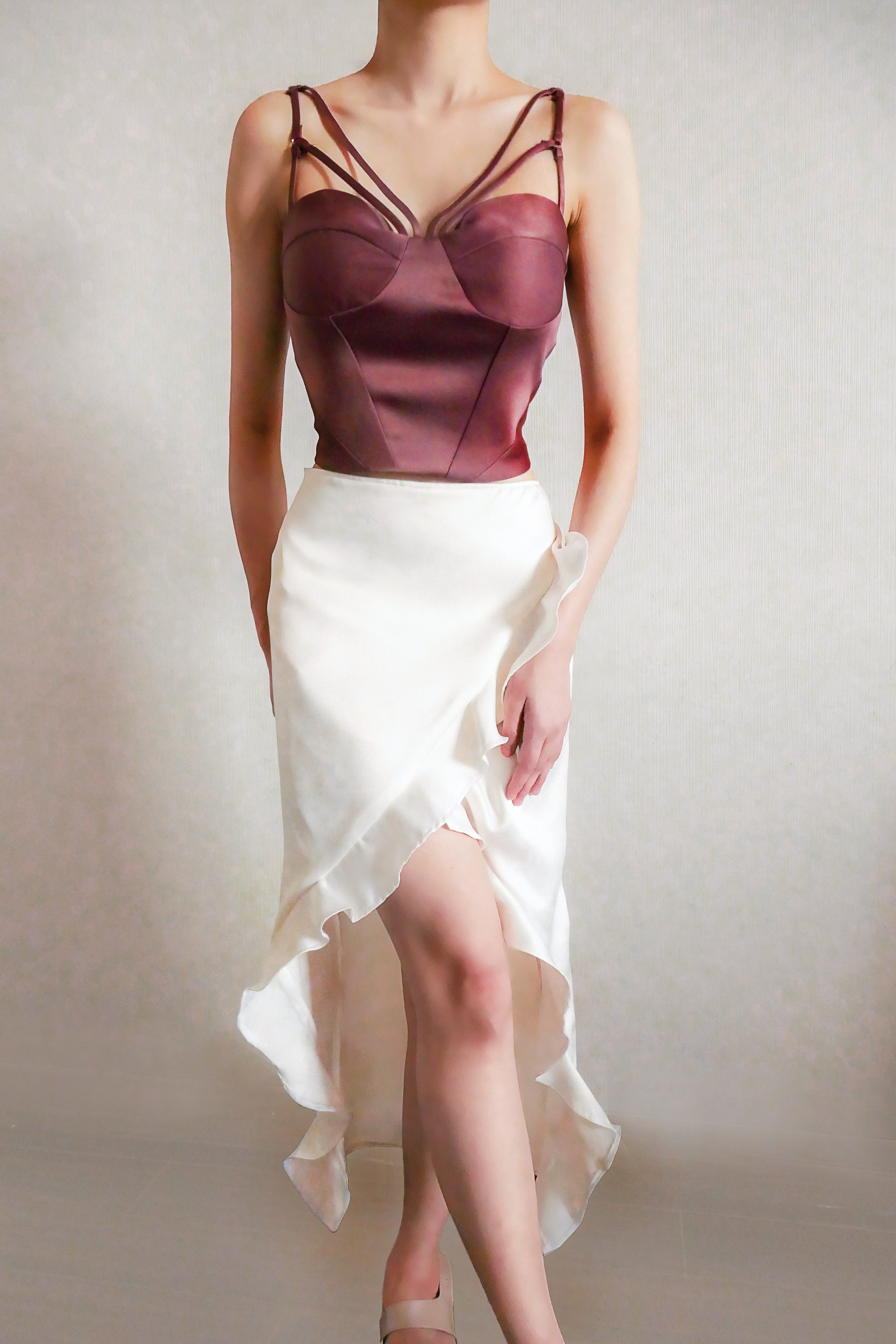 Our Delphin Midi skirt is cut on the bias from our lustrous Japanese duchess satin that flows effortlessly across the hips. For the feminine floaty finish that takes you from day to night, delicate ruffles skim beautifully across the sides.