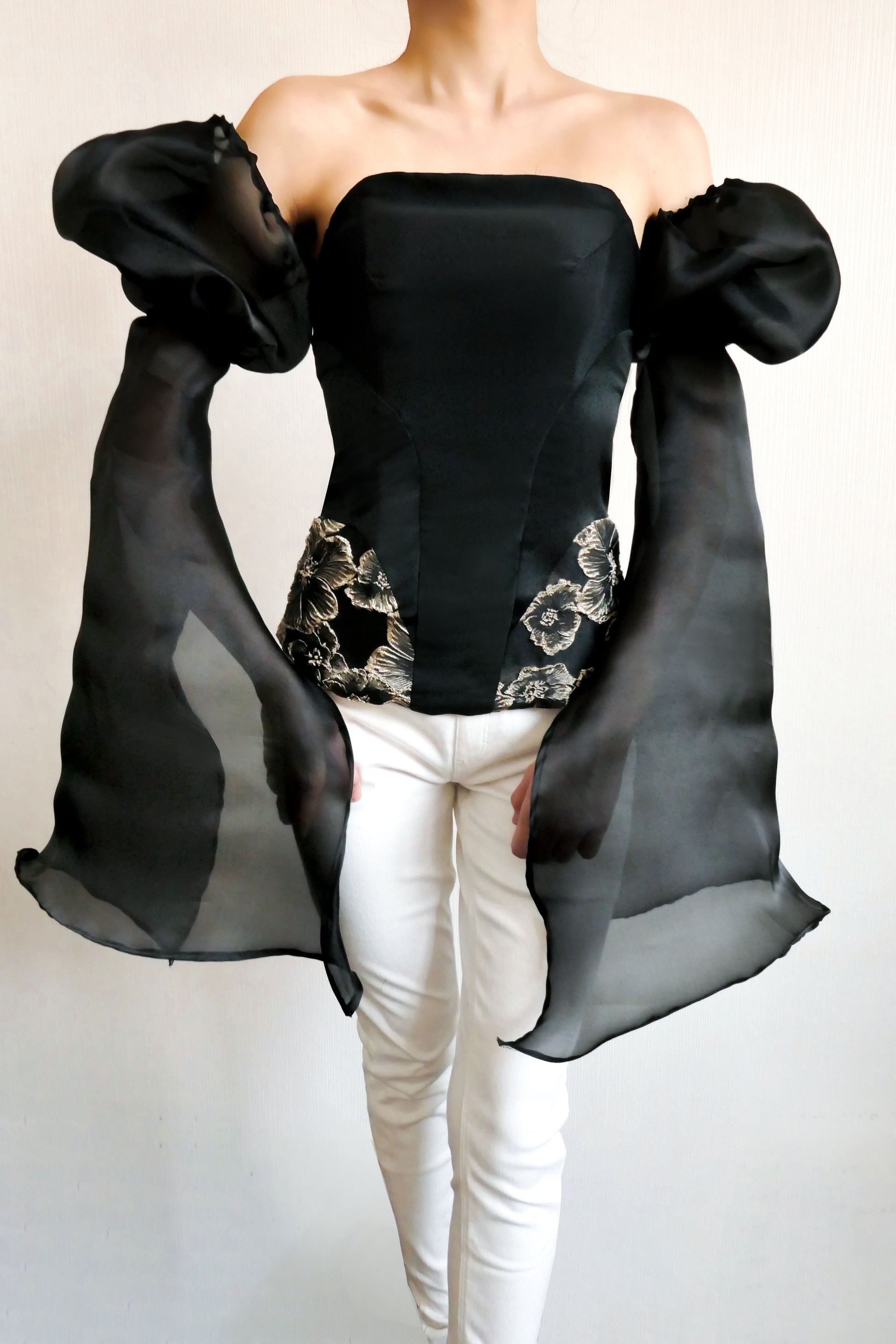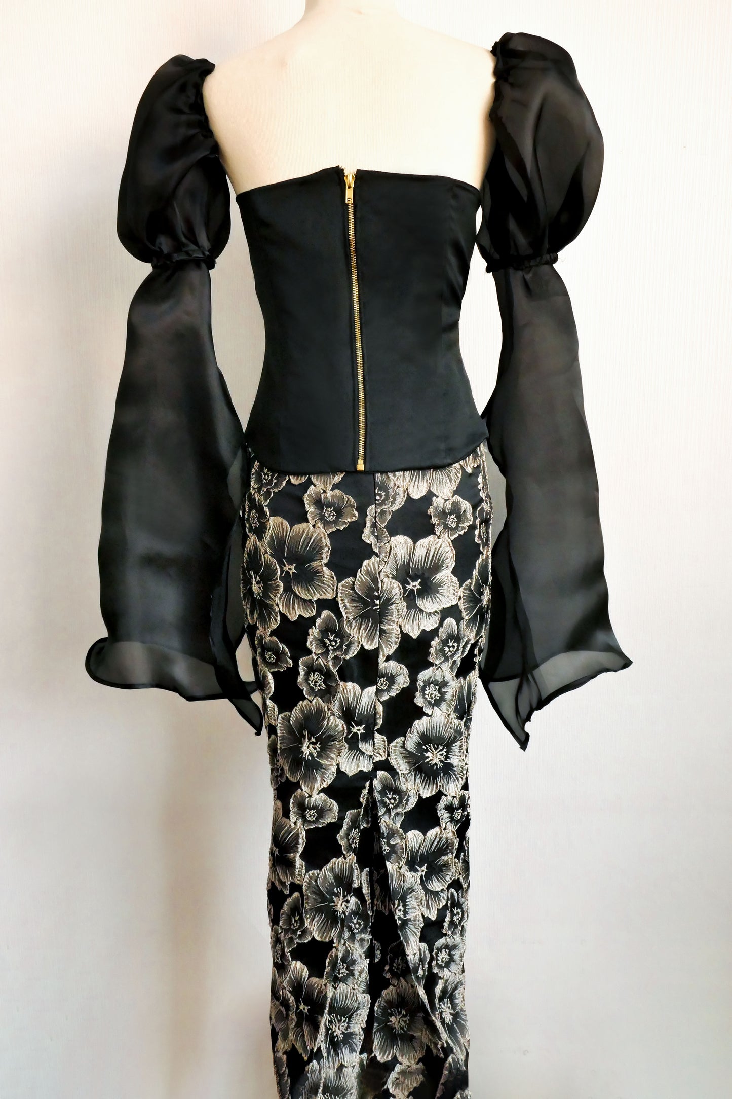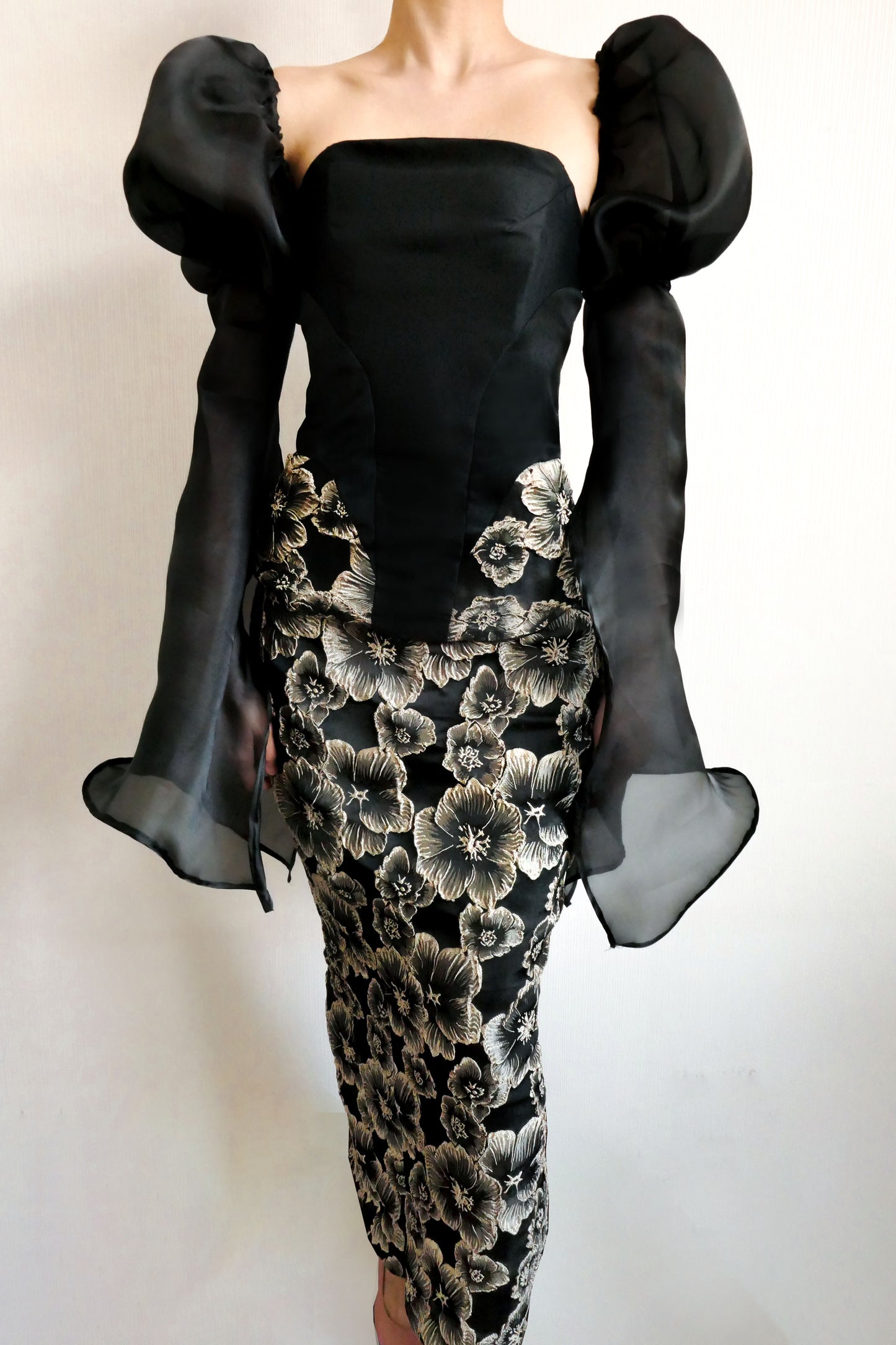 - Fabric: Satin, 3D Gold Jacquard Flowers & Organza Puff Sleeve